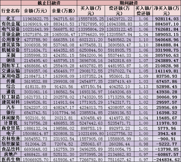從行業(yè)分布來看,9月份以來,在28個(gè)申萬一級(jí)行業(yè)中,23個(gè)行業(yè)期間獲融資凈買入。其中,化工、有色金屬、電氣設(shè)備等三行業(yè)最受融資客青睞,融資凈買入額均超70億元,分別為92.81億元、88.45億元和76.27億元,合計(jì)達(dá)257.53億元;緊隨其后的是非銀金融、公用事業(yè)等兩行業(yè),融資凈買入額均超50億元。