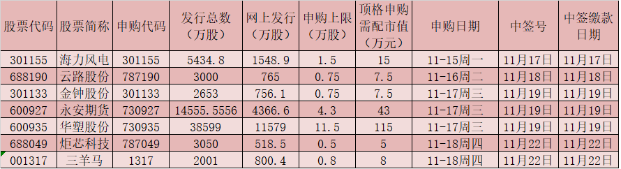 表:下周(11月15日-11月19日)新股申購情況:
