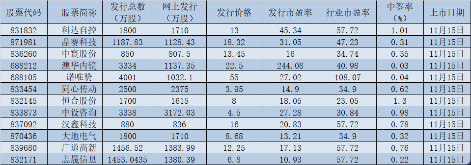 表:下周(11月15日-11月19日)新股上市情況: