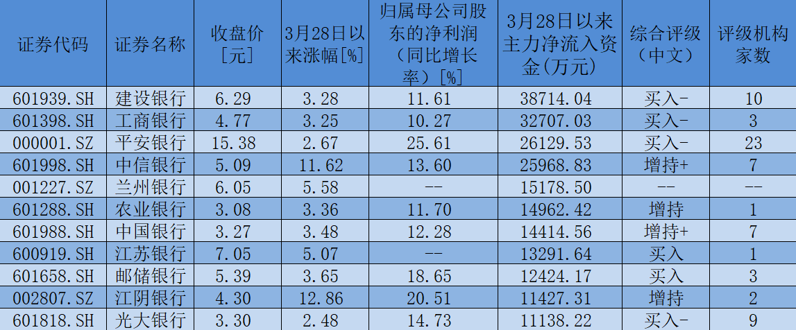 表:3月28日以來,銀行業(yè)主力凈流入資金超過1億元個股一覽