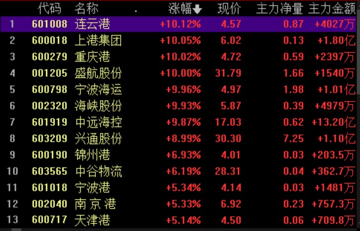 港口航運板塊表現(xiàn)強勢,包括連云港、上港集團、重慶港等在內(nèi)的6只個股集體漲停。