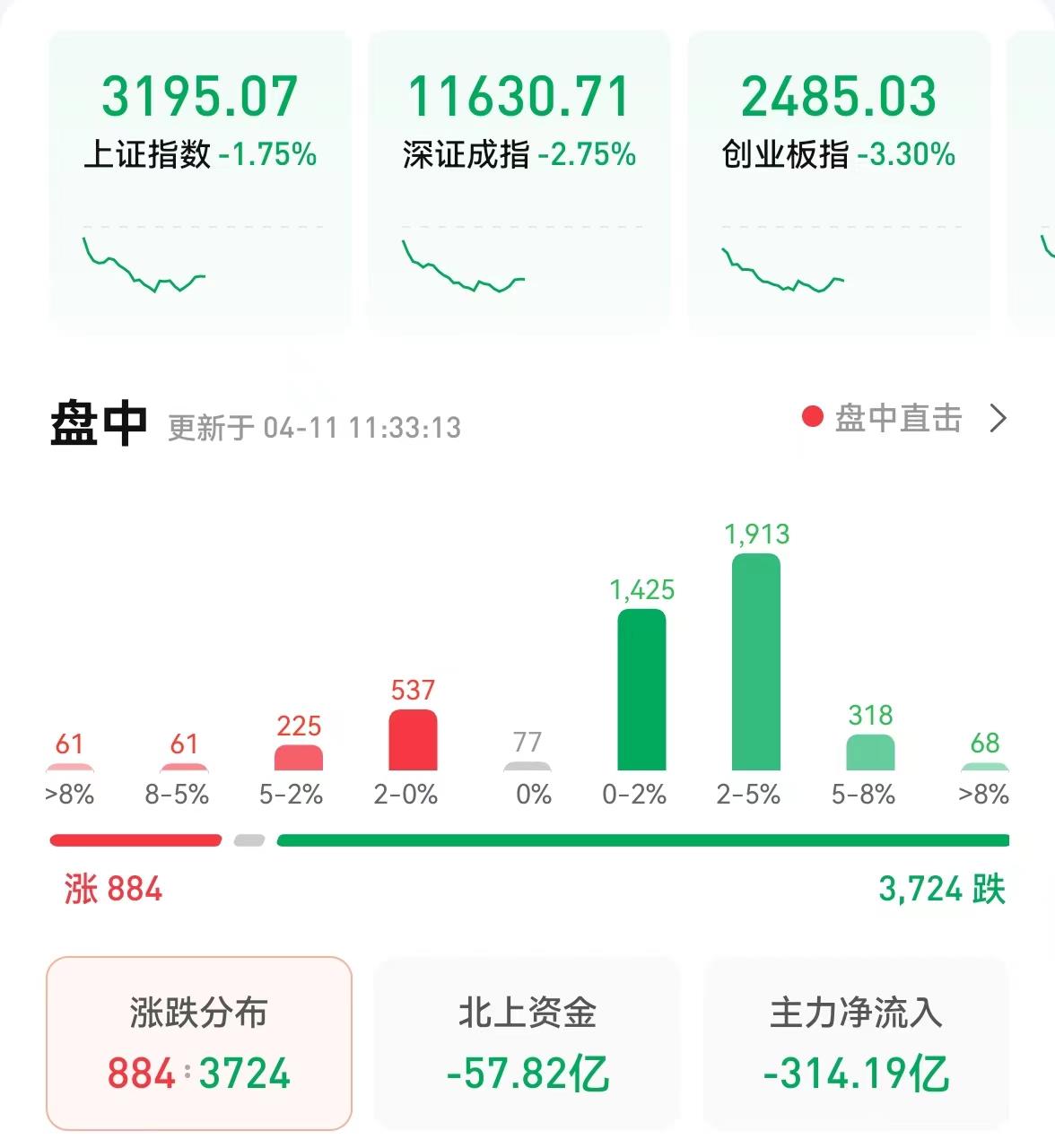 4月11日,A股三大指數(shù)呈震蕩回落態(tài)勢。截至上午收盤,上證指數(shù)跌幅達(dá)1.75%,報(bào)3195.07點(diǎn);深證成指和創(chuàng)業(yè)板指跌幅分別為2.75%和3.3%;滬深兩市合計(jì)成交額6048.9億元;總體來看,兩市個(gè)股跌多漲少,上漲家數(shù)達(dá)884家。