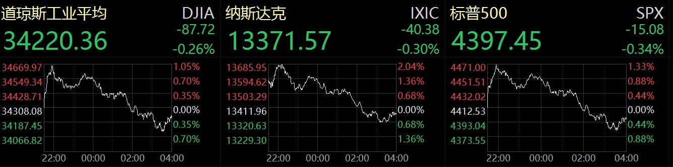 市場表現(xiàn)方面,當(dāng)?shù)貢r間4月12日,美股三大指數(shù)高開低走,道指和標(biāo)普500指數(shù)盤中一度漲逾1%,納指最高漲超2%,不過,三大指數(shù)集體收跌,截至收盤,道瓊斯指數(shù)跌0.26%,報34220.36點;標(biāo)普500指數(shù)跌0.34%,報4397.45點;納斯達克指數(shù)跌0.3%,報13371.57點。
