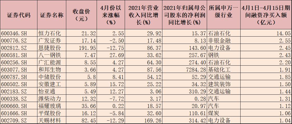 部分績(jī)優(yōu)股也獲得融資客的青睞。4月份以來截至4月15日,上述1265只績(jī)優(yōu)股中有229只期間獲得融資客加倉(cāng),合計(jì)凈買入額為72.62億元,其中,恒力石化期間獲融資客加倉(cāng)額位居首位,為14.05億元,廣發(fā)證券、恩捷股份、八一鋼鐵、廣匯能源等4只個(gè)股期間獲融資客凈買入額均超2億元。
