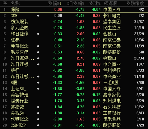 保險板塊上漲0.06%,其余概念與行業(yè)均出現(xiàn)不同程度回落,包括化肥、旅游酒店在內(nèi)的5類板塊跌幅超6%。