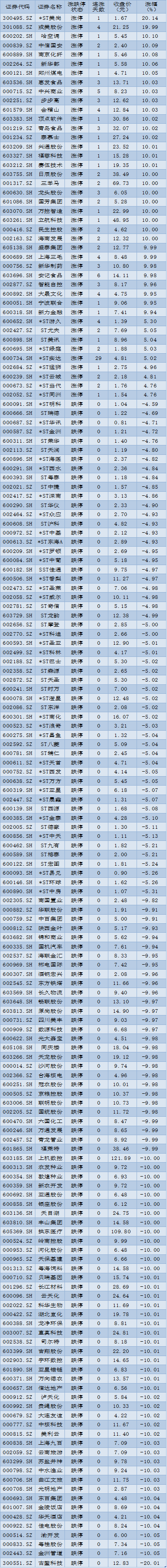 周四(4月21日)漲跌停個股情況: