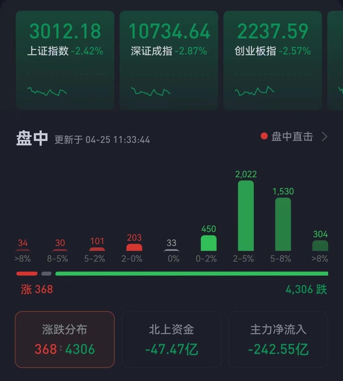 4月25日,A股繼續(xù)震蕩回落。截至上午收盤,三大指數跌幅均超2%,上證指數跌幅達2.42%,報3012.18點,逼近3000點整數關口;深證成指和創(chuàng)業(yè)板指跌幅分別為2.87%和2.57%;滬深兩市合計成交額5110.4億元;總體來看,兩市個股漲少跌多,上漲個股368只,下跌個股達4306只。