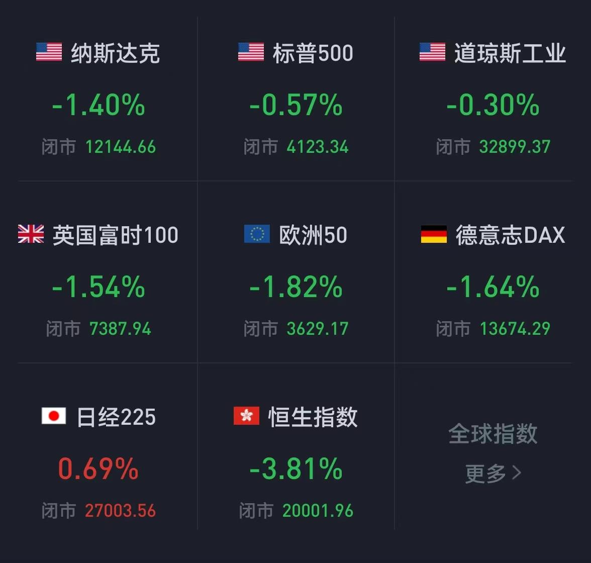 本周,道瓊斯工業(yè)指數(shù)累計周跌幅0.24%,標(biāo)普500指數(shù)累計周跌幅0.21%,連續(xù)5周收跌,創(chuàng)2011年來最長紀(jì)錄,納指累計周跌幅1.54%,連續(xù)5周收跌,創(chuàng)2012年來最長紀(jì)錄。德國DAX指數(shù)累計周跌幅3%,法國CAC40指數(shù)累計周跌幅4.22%,英國富時100指數(shù)累計周跌幅2.08%。