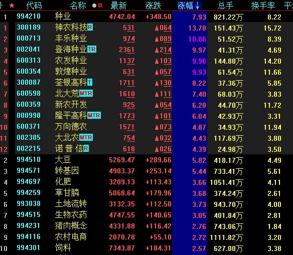 具體來看,5月16日上午,農業(yè)股異軍突起,表現(xiàn)出色。其中,種業(yè)板塊漲幅居首達7.93%,豐樂種業(yè)、農發(fā)種業(yè)和敦煌種業(yè)等3只種業(yè)概念股集體漲停。與此同時,農業(yè)股中的大豆、豬肉概念等板塊漲幅居前,分別為5.82%、2.76%。
