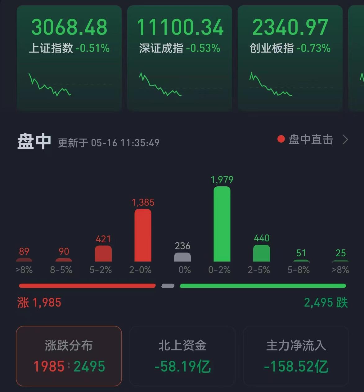5月16日,三大股指震蕩回落。截至上午收盤,上證指數(shù)跌幅達0.51%,報3068.48點;深證成指和創(chuàng)業(yè)板指跌幅分別為0.53%和0.73%;滬深兩市合計成交額5254.4億元;總體來看,兩市個股漲少跌多,上漲個股達1985只,有2495只個股下跌。
