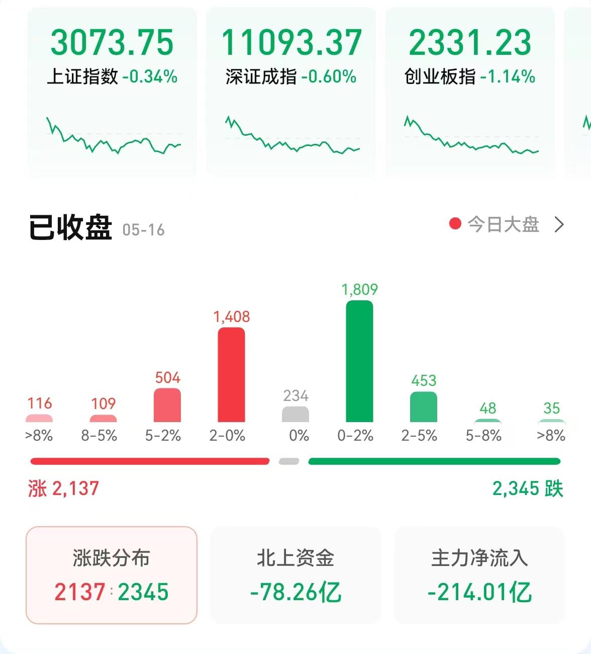 5月16日,三大股指高開低走,集體收跌,截至收盤,上證指數(shù)跌0.34%,報3073.75點;深證成指跌0.6%,報11093.37點;創(chuàng)業(yè)板指跌1.14%,報2331.23點;滬深兩市合計成交額7862億元;北向資金凈賣出78.26億元;總體來看,兩市個股跌多漲少。