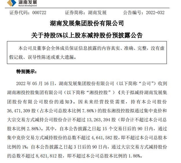 5月16日,熱門基建股湖南發(fā)展再度漲停,截至收盤,報25.54元,錄得14日11板,期間累計漲達199.41%。今日收盤后,湖南發(fā)展發(fā)布了《關(guān)于持股5%以上股東減持股份預(yù)披露公告》。