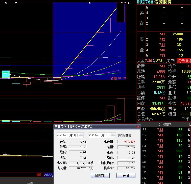 5月18日,索菱股份再度漲停,截至收盤,報7.43元,連續(xù)6個交易日漲停,期間累計漲幅達77.33%。