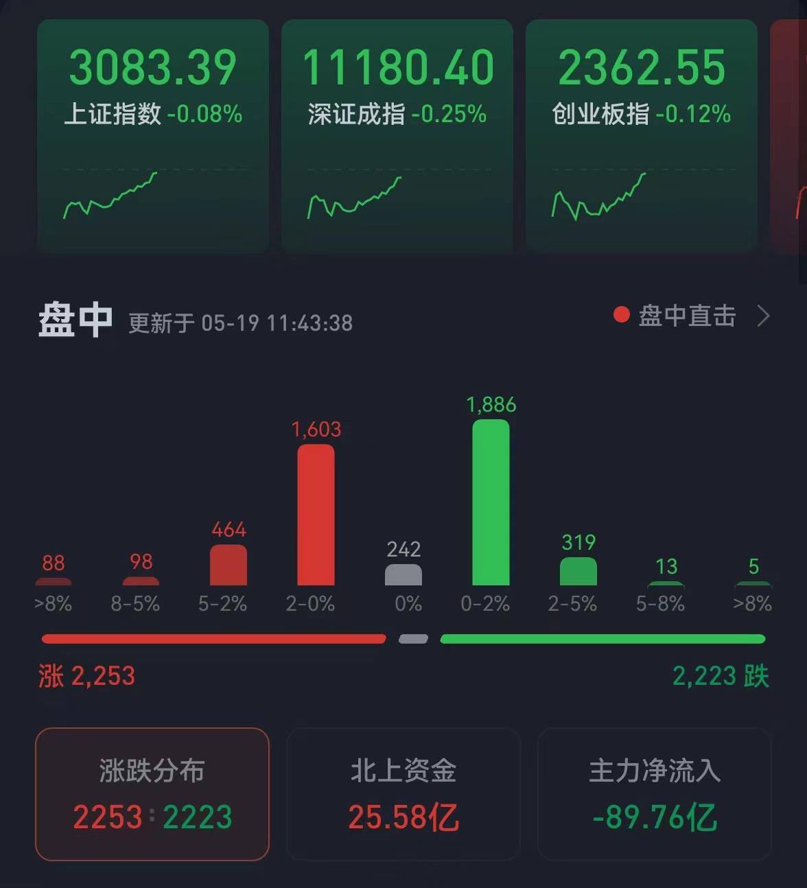 5月19日,三大股指低開后震蕩攀升。截至上午收盤,上證指數(shù)跌0.08%,報(bào)3083.39點(diǎn);深證成指和創(chuàng)業(yè)板指跌幅分別為0.25%和0.12%;滬深兩市合計(jì)成交額4735.3億元;總體來看,兩市上漲個(gè)股達(dá)2253只,有2223只個(gè)股下跌。