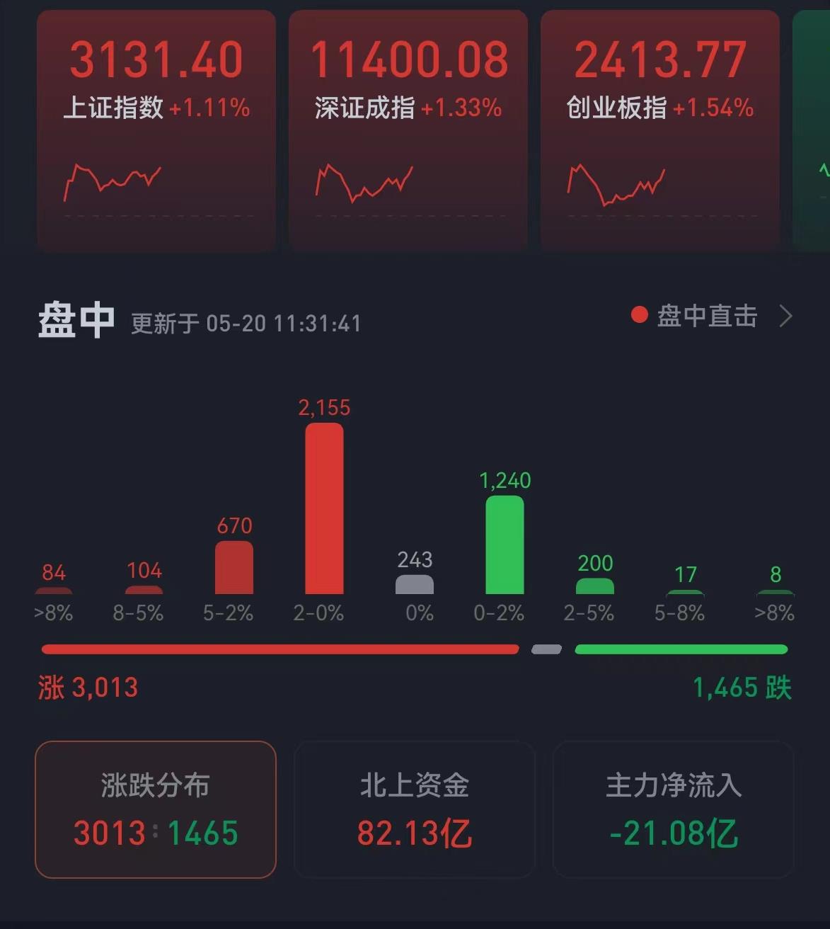 5月20日上午,A股三大股指全線飄紅,漲幅均超1%。截至上午收盤,上證指數(shù)漲幅達1.11%,報3131.4點;深證成指和創(chuàng)業(yè)板指漲幅分別為1.33%和1.54%;滬深兩市合計成交額5666.3億元;總體來看,兩市個股漲多跌少,上漲個股達3013只,有1465只個股下跌。