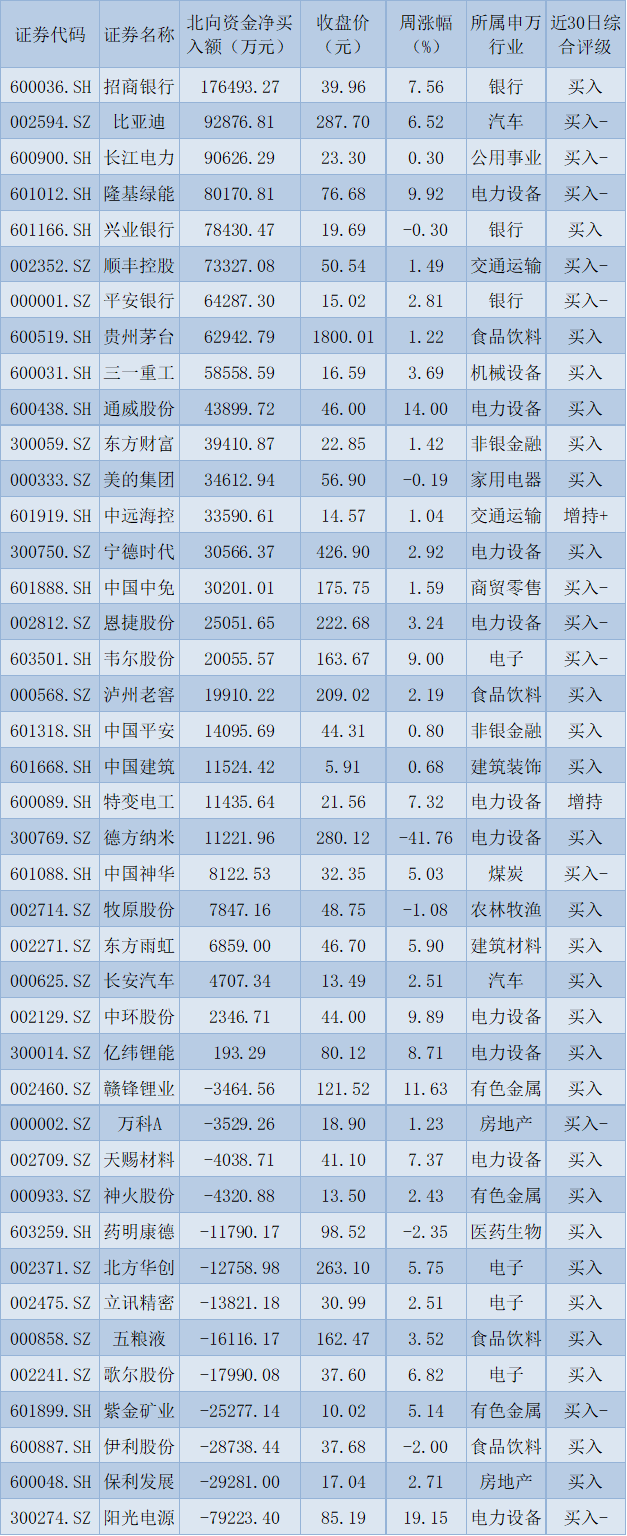 資金方面,北向資金本周累計(jì)凈買入金額達(dá)152.18億元。從前十大成交活躍股來(lái)看,本周,招商銀行、比亞迪和長(zhǎng)江電力等3只個(gè)股,北向資金凈買入金額均超9億元。另外,陽(yáng)光電源、保利發(fā)展、伊利股份、紫金礦業(yè)等個(gè)股遭北向資金凈賣出金額均超2億元。