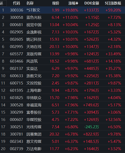 從個(gè)股來(lái)看,傳媒行業(yè)143只交易的個(gè)股中,有137只上漲,其中,有9只漲停報(bào)收。