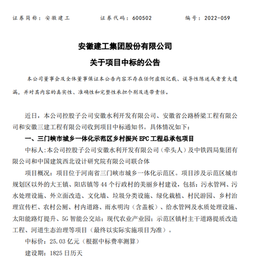 安徽建工公告,公司控股子公司安徽水利開(kāi)發(fā)有限公司(牽頭人)及中鐵四局集團(tuán)有限公司和中國(guó)建筑西北設(shè)計(jì)研究院有限公司聯(lián)合體中標(biāo)三門峽市城鄉(xiāng)一體化示范區(qū)鄉(xiāng)村振興EPC工程總承包項(xiàng)目,中標(biāo)價(jià)25.03億元;公司控股子公司安徽省公路橋梁工程有限公司中標(biāo)G36寧洛高速公路明光至蚌埠段改擴(kuò)建工程施工TJ-01標(biāo)段項(xiàng)目,中標(biāo)價(jià)6.69億元;公司控股子公司安徽三建工程有限公司中標(biāo)引江濟(jì)淮工程同大鎮(zhèn)二龍安置點(diǎn)(二期)及同大鎮(zhèn)集鎮(zhèn)安置點(diǎn)項(xiàng)目,中標(biāo)價(jià)10.90億元。合計(jì)中標(biāo)金額42.62億元。