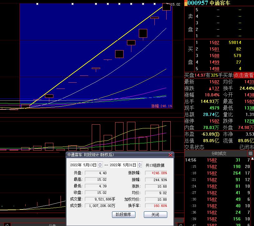 5月31日,核酸檢測車概念股中通客車再次漲停,收于15.02元/股,總市值為89.05億元。這是自5月13日起,中通客車收獲的第13個(gè)漲停,累計(jì)漲幅246.08%。
