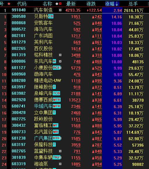 具體來看,6月1日上午,汽車制造板塊異軍突起,漲幅居首達(dá)2.94%,其中,包括貝斯特、安凱客車、海馬汽車、廣東鴻圖、英利汽車、東風(fēng)汽車等在內(nèi)的10只汽車股集體漲停。