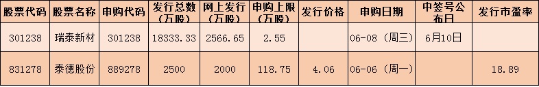 根據(jù)新股發(fā)行安排,下周(6月6日-10日)僅有2只新股申購(gòu)。其中,北交所新股泰德股份是國(guó)內(nèi)汽車空調(diào)器軸承龍頭,創(chuàng)業(yè)板新股瑞泰新材是國(guó)內(nèi)鋰離子電解液龍頭供應(yīng)商。