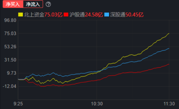 資金方面,北向資金早盤凈買入75.03億元,其中,滬股通凈買入24.58億元;深股通凈買入50.45億元。