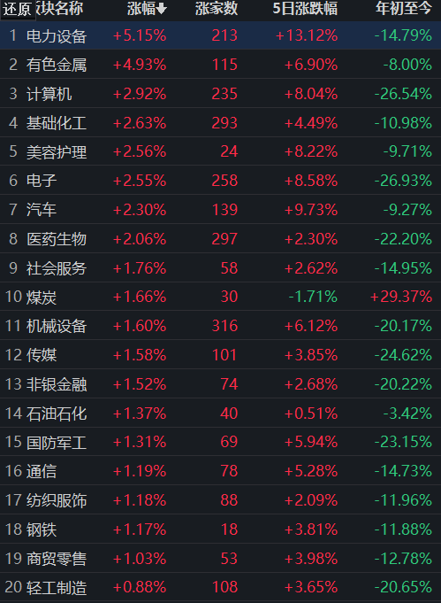 申萬行業(yè)方面,截至6月6日11:30,31類行業(yè)中有25類上漲,占比80.65%。電力設(shè)備行業(yè)居漲幅榜首,漲幅達(dá)5.15%,此外,有色金屬行業(yè)漲幅也超過4%;跌幅居首的行業(yè)是房地產(chǎn),下跌1.43%。