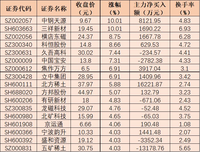 表:6月6日上午稀土永磁板塊漲幅超4%的個股一覽