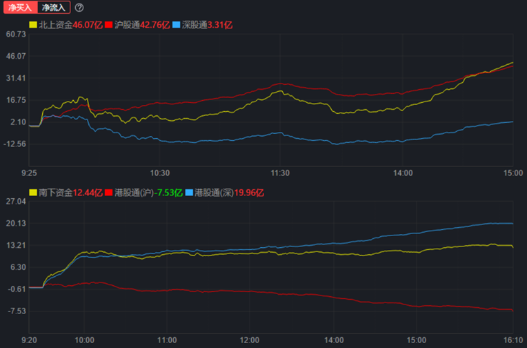 北向資金今日呈凈流入態(tài)勢,全天凈買入46.07億元,其中,滬股通凈買入42.76億元,深股通凈買入3.31億元。