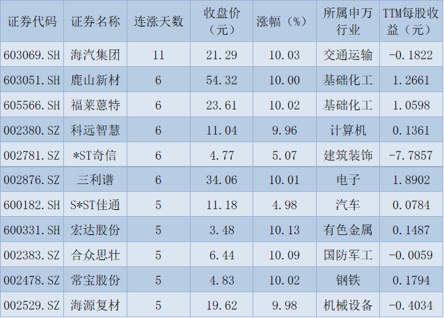 表:連續(xù)上漲5天且今日收盤漲停股一覽