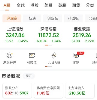 6月9日,A股三大指數(shù)上午集體下跌,創(chuàng)業(yè)板指數(shù)跌超2%。截至上午11:30,上證指數(shù)跌0.49%,報(bào)3247.86點(diǎn);深證成指跌1.34%,報(bào)11872.52點(diǎn),創(chuàng)業(yè)板指跌2.22%,報(bào)2519.26點(diǎn);滬深兩市合計(jì)成交額6065.64億元;總體來(lái)看,A股市場(chǎng)個(gè)股跌多漲少,上漲個(gè)股為802只,下跌個(gè)股3907只。