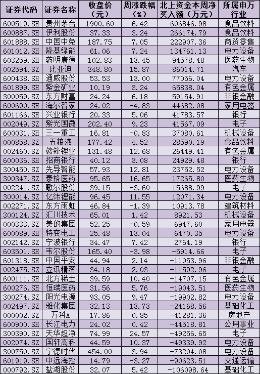 資金方面,北向資金本周累計凈買入金額達368.3億元,創(chuàng)年內(nèi)新高。從前十大成交活躍股來看,本周,貴州茅臺、伊利股份、中國中免、隆基綠能等4只個股,北向資金凈買入金額均超10億元。另外,鹽湖股份、中遠???、寧德時代等個股遭北向資金凈賣出金額均超5億元。