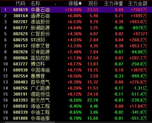 從領(lǐng)漲的油氣開采及服務(wù)行業(yè)看,截至6月14日11:30,行業(yè)的21只個股中,中曼石油漲停,準(zhǔn)油股份、通源石油等2只個股漲幅均超6%。