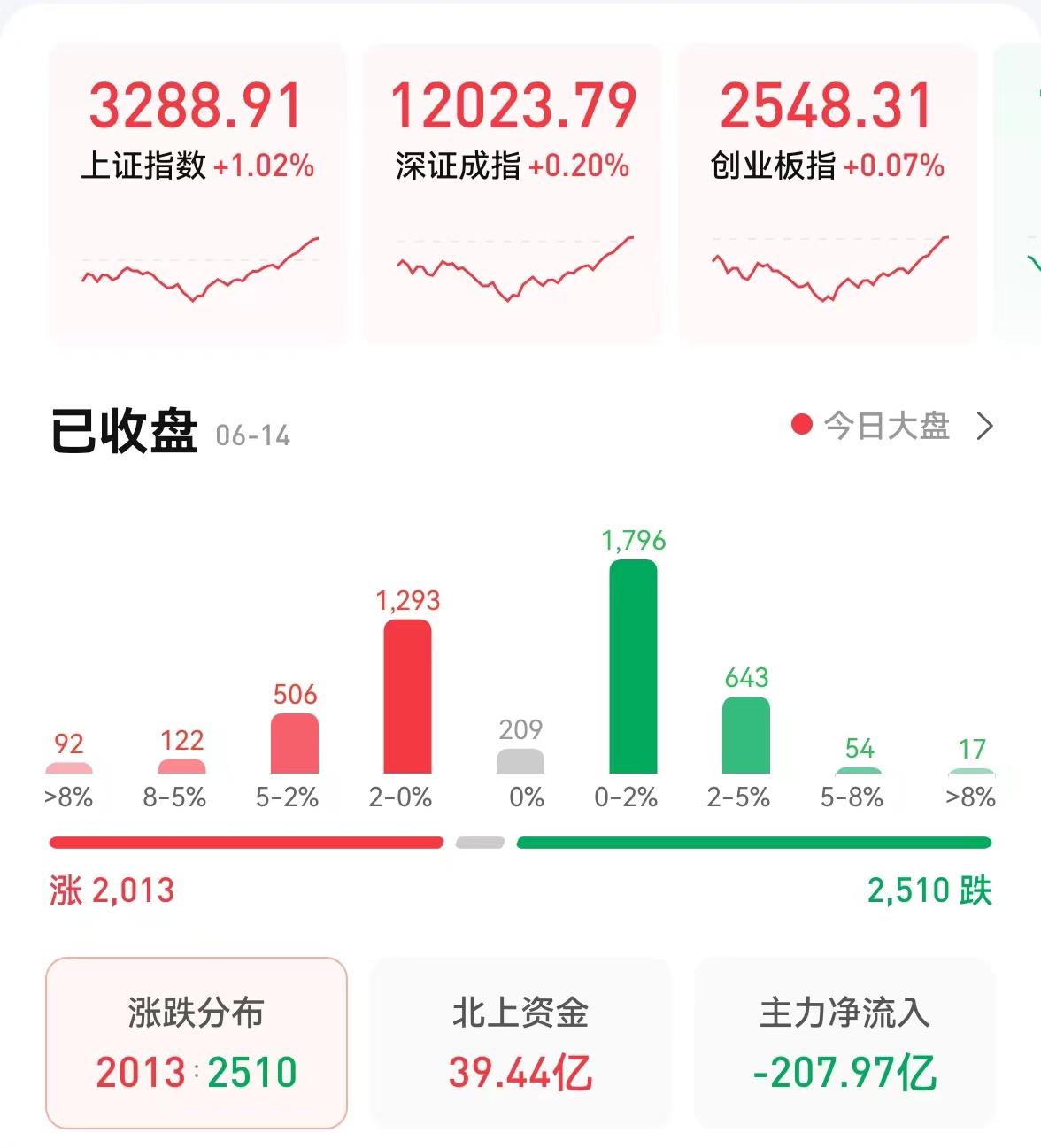 6月14日,三大股指低開高走,全線飄紅,截至收盤,上證指數(shù)漲1.02%報3288.91點,深證成指漲0.2%報12023.79點,創(chuàng)業(yè)板指漲0.07%報2548.31點;兩市合計成交10994億元,連續(xù)第3個交易日突破萬億元;北向資金凈買入39.44億元??傮w來看,兩市個股跌多漲少。