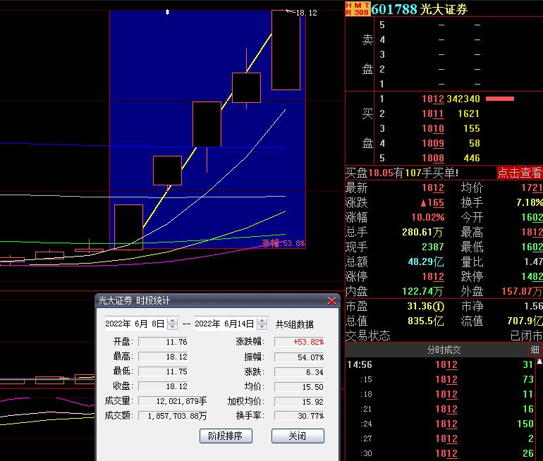 6月14日,券商板塊漲幅居首達5.39%。光大證券、財達證券、永安期貨、中信建投、紅塔證券、長城證券等6只個股集體漲停。值得注意的是,光大證券近日表現(xiàn)強勢,近5個交易日中,斬獲4個漲停板,期間累計漲幅達53.82%。