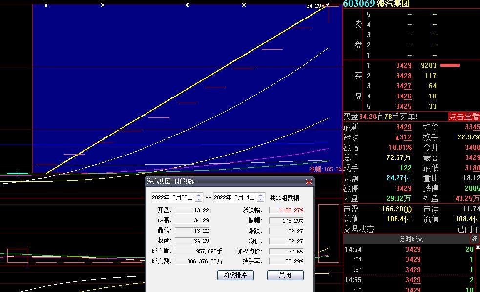 6月14日,熱門股海汽集團再度漲停,截至收盤,報34.29元,總市值達108.4億元,走出了11連板,期間累計漲達185.27%。