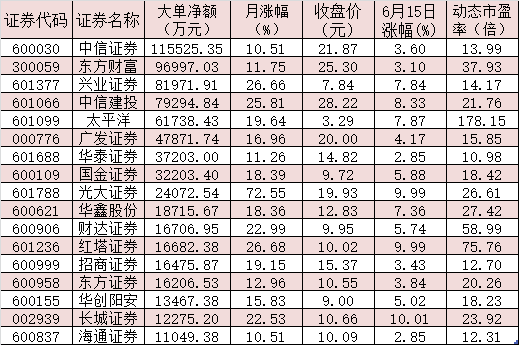 表:6月15日大單資金凈流入超過1億元的券商股一覽
