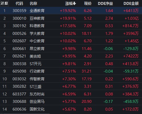 教育板塊大漲3.95%!3.76億元大單資金搶籌13只教育股2022-06-15 20:43