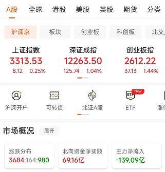 6月16日,A股三大指數(shù)上午集體上漲,創(chuàng)業(yè)板指數(shù)漲超1%。截至上午11:30,上證指數(shù)漲0.25%,報(bào)3313.53點(diǎn);深證成指漲1.04%,報(bào)12263.50點(diǎn),創(chuàng)業(yè)板指漲1.44%,報(bào)2612.22點(diǎn);滬深兩市合計(jì)成交額6676.86億元;總體來(lái)看,A股市場(chǎng)個(gè)股漲多跌少,上漲個(gè)股為3684只,下跌個(gè)股980只。