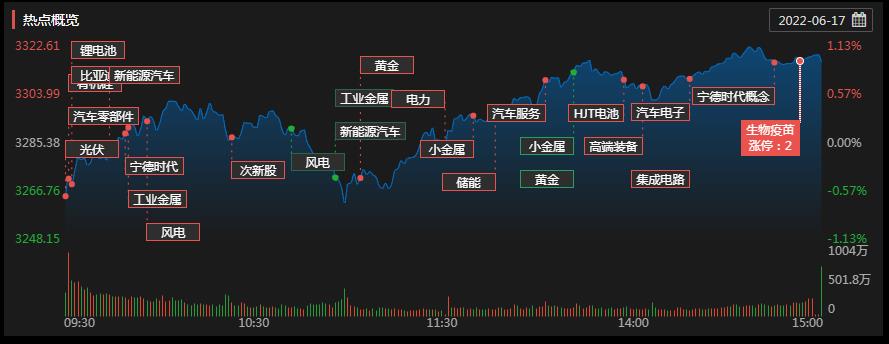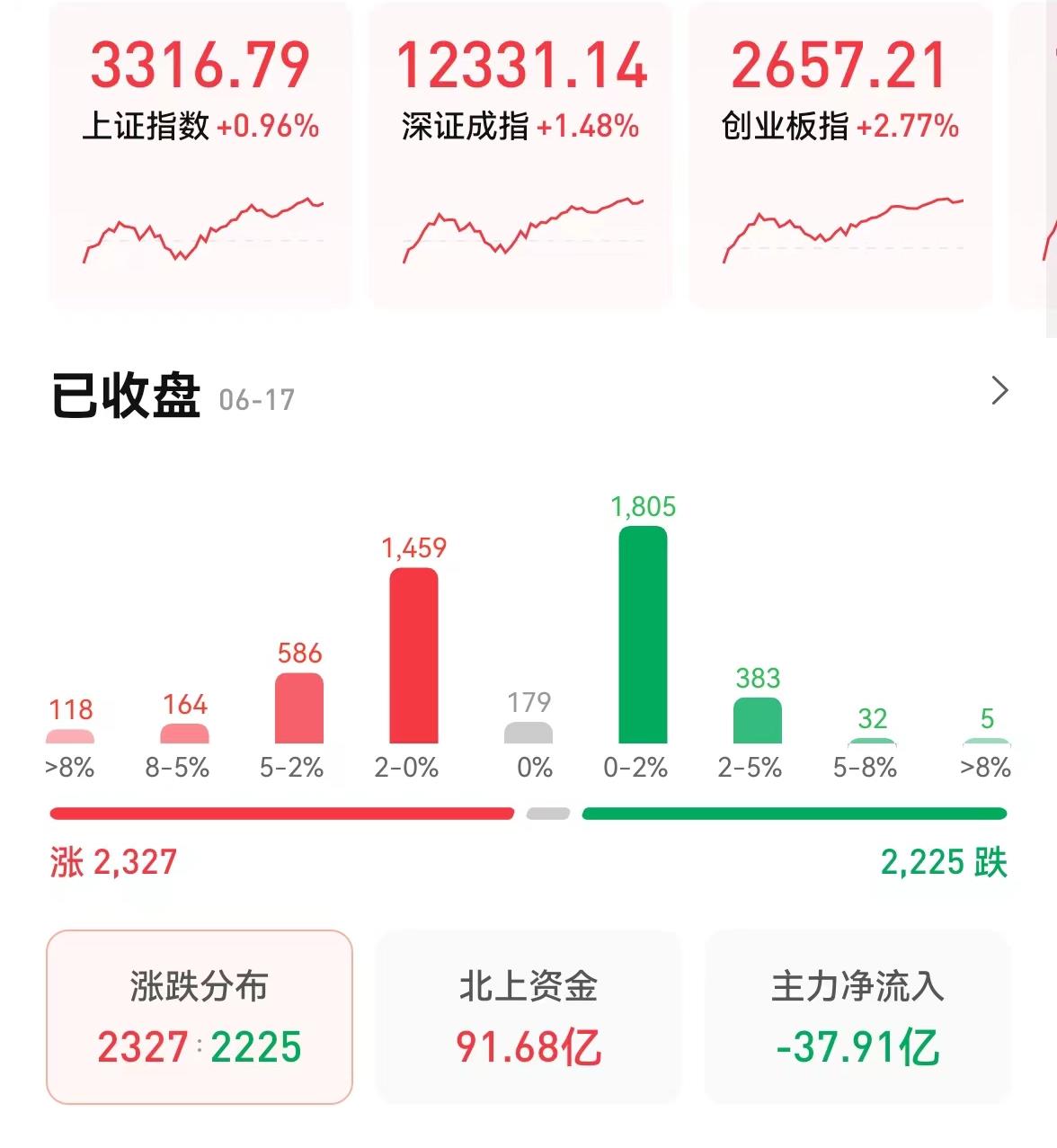 6月17日,三大股指低開高走,集體收漲,截至收盤,上證指數(shù)漲0.96%報(bào)3316.79點(diǎn),深證成指漲1.48%報(bào)12331.14點(diǎn),創(chuàng)業(yè)板指漲2.77%報(bào)2657.21點(diǎn);兩市合計(jì)成交10934億元,連續(xù)第6個(gè)交易日突破萬億元;北向資金凈買入91.68億元??傮w來看,A股個(gè)股漲多跌少。其中,有76只個(gè)股漲停。