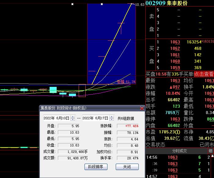6月17日,集泰股份再度漲停,截至收盤,報(bào)10.63元,總市值達(dá)39.62億元,連續(xù)6個(gè)交易日漲停,期間累計(jì)漲幅達(dá)77.46%。