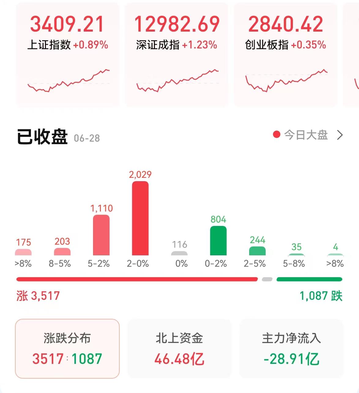 6月28日,A股三大指數(shù)全線飄紅,上證指數(shù)走出日線四連陽,成功站上3400點整數(shù)關(guān)口。兩市合計成交12213億元,連續(xù)第4個交易日突破萬億元。北向資金凈買入超46億元。市場熱點紛呈,電子、社會服務、交通運輸、煤炭等行業(yè)漲幅居前,備受矚目。經(jīng)過2個月的反彈,A股的上漲行情能否延續(xù)呢?