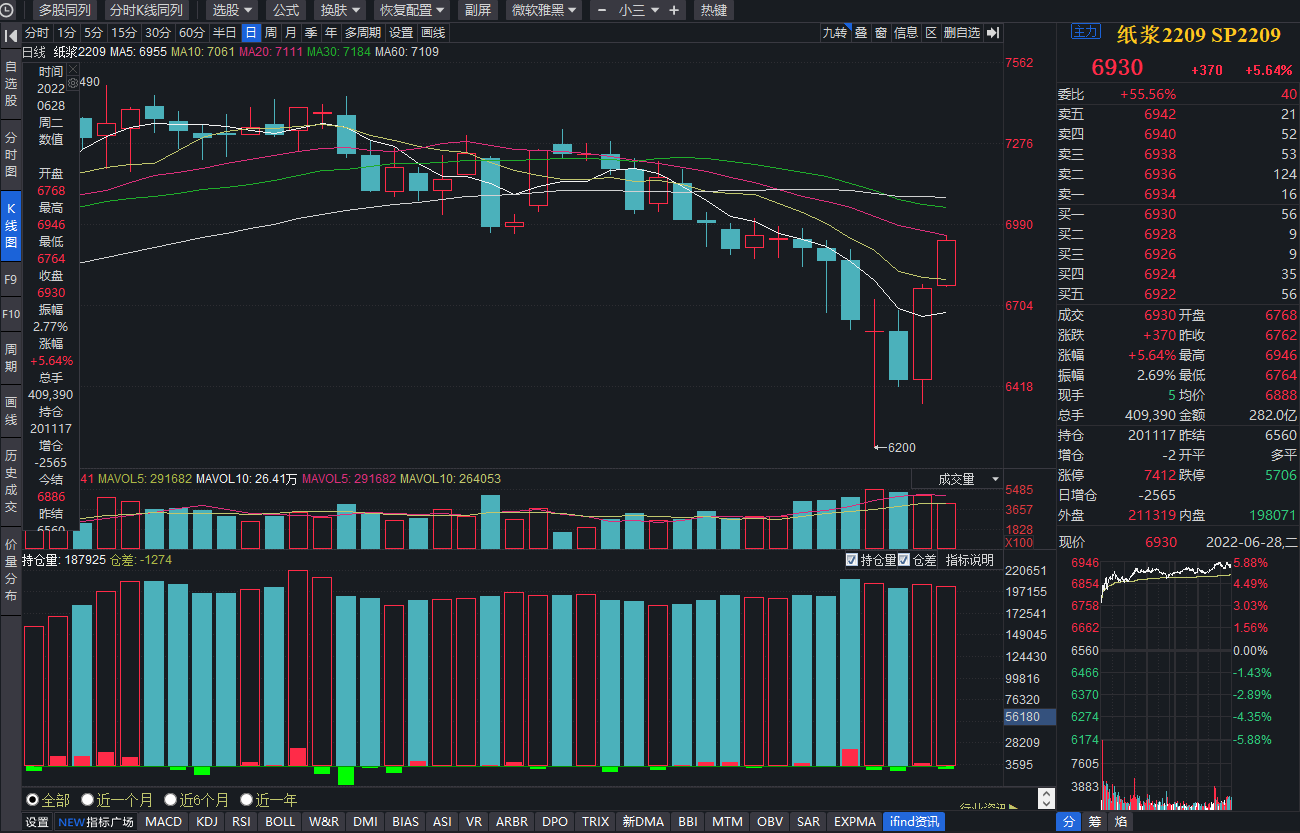 受現(xiàn)貨價(jià)格強(qiáng)勁支撐,紙漿期貨價(jià)格今日大幅上漲。同花順數(shù)據(jù)顯示,6月28日,上期所9月份交貨的紙漿期貨主力合約(紙漿2209合約)上漲5.64%,創(chuàng)6個(gè)多月以來,最大單日漲幅,收盤價(jià)為6930元/噸,在上期所各期貨品種中漲幅位居前列。且本周以來,該期貨主力合約已上漲7.71%。