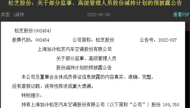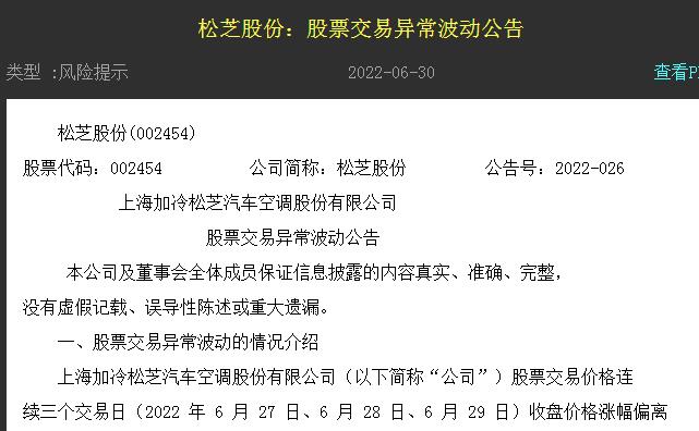 今日收盤后,松芝股份發(fā)布公告,公司股票交易價格連續(xù)三個交易日(2022年6月27日、6月28日、6月29日)收盤價格漲幅偏離值累計超過20%,根據(jù)《深圳證券交易所股票交易規(guī)則》的有關(guān)規(guī)定,屬于股票交易異常波動的情況。