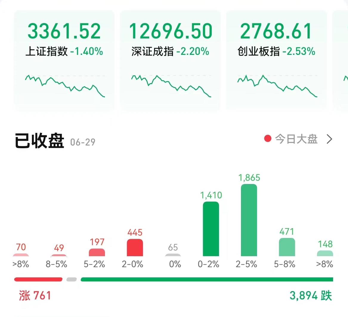6月29日,三大股指震蕩回落,集體收跌,截至收盤,上證指數(shù)跌1.4%報3361.52點,深證成指跌2.2%報12696.5點;創(chuàng)業(yè)板指跌2.53%報2768.61點;兩市合計成交13162億元,連續(xù)第5個交易日突破萬億元;北向資金凈賣出16.83億元。總體來看,兩市個股跌多漲少。