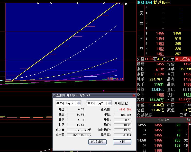 6月29日,熱門股松芝股份再度漲停,截至收盤,報14.55元,連續(xù)9個交易日漲停,期間累計漲達136.59%。