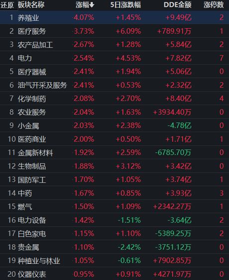 從領(lǐng)漲的養(yǎng)殖業(yè)看,截至7月4日11:30,行業(yè)交易中的26只個(gè)股,有25只上漲,其中正邦科技封漲停板。從資金流向看,養(yǎng)殖業(yè)上午大單資金凈流入額達(dá)9.49億元,居各行業(yè)第1位。