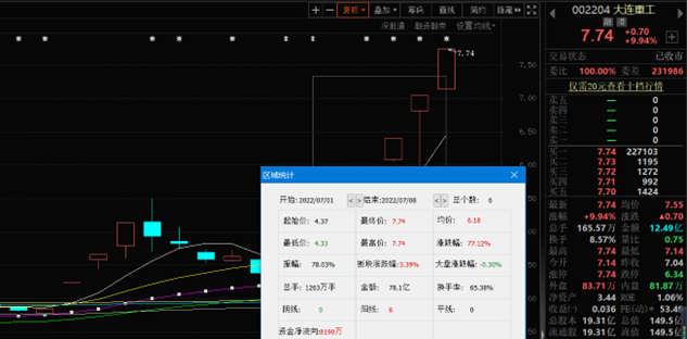7月8日,大連重工再度漲停,報7.74元,自7月1日以來,截至7月8日已連續(xù)6個交易日以漲停板報收,累計漲幅達77.12%。