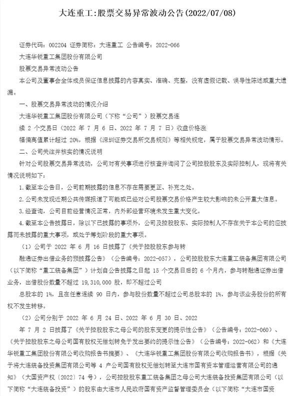 大連重工股票交易異常波動公告,其中關于公司認為必要的風險提示2中,重述了6月18日披露的中報預告:“預計2022年半年度歸屬于上市公司股東的凈利潤為盈利15,000萬元-19,000萬元,比上年同期增長155.89%-224.13%。”