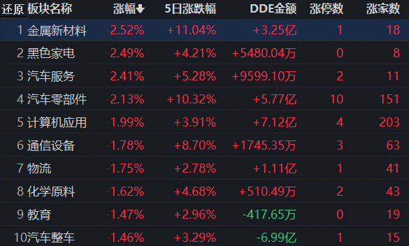 同花順行業(yè)方面,截至7月19日11:30,76類行業(yè)中有50類上漲,占比65.79%。金屬新材料行業(yè)居漲幅榜首,漲幅達(dá)2.52%,此外,包括黑色家電和汽車服務(wù)等在內(nèi)的3類行業(yè)漲幅也均超2%;下跌超1%的行業(yè)分別為養(yǎng)殖業(yè)和電力,分別下跌1.11%和1.07%。